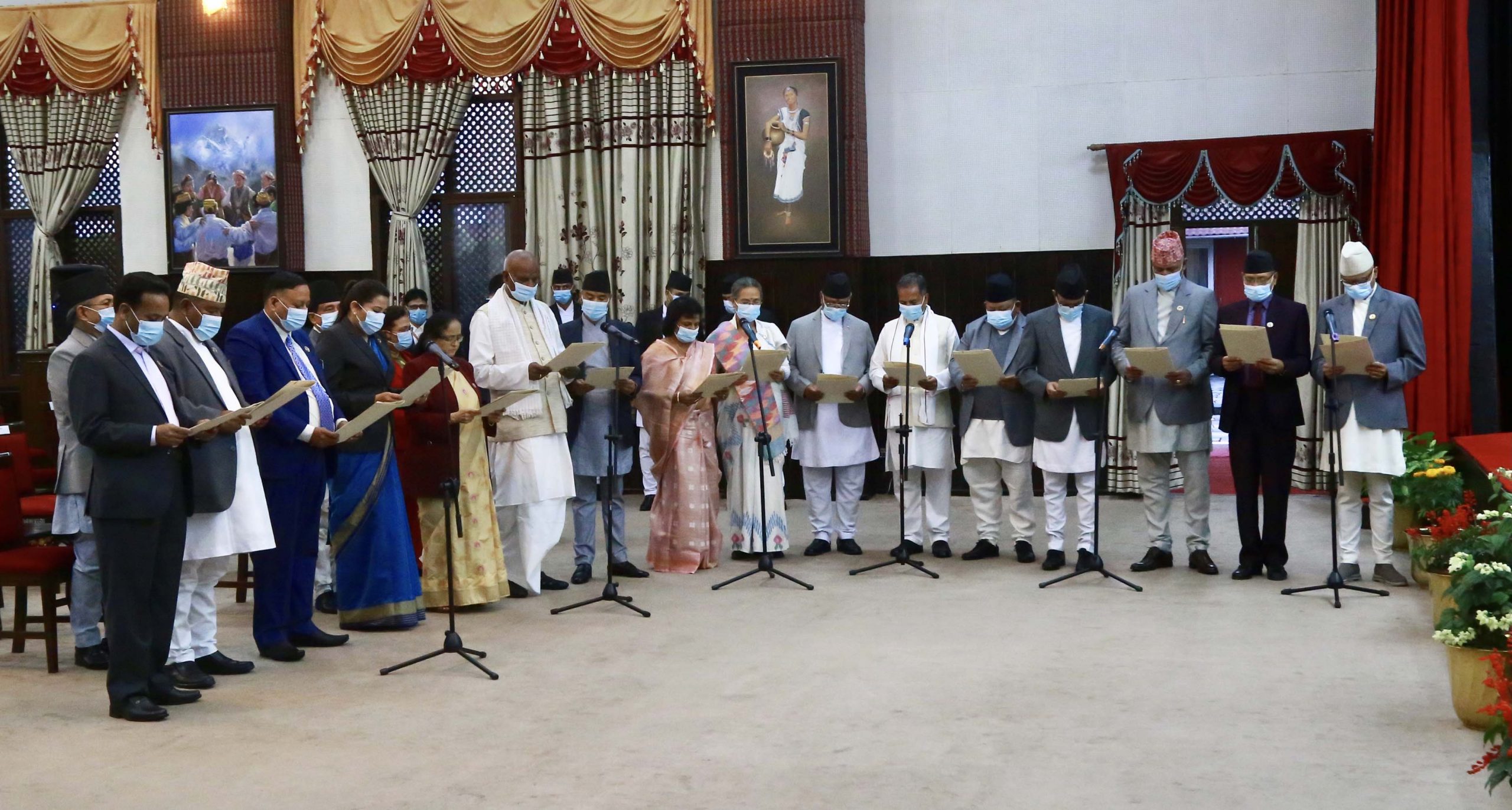 नेपाली काँग्रेसबाट गृहमा बालकृष्ण खाण, सञ्चारमा ज्ञानेन्द्र कार्की, परराष्ट्रमा नारायण खड्का, रक्षामा मिनेन्द्र रिजाल, कानुनमा दिलेन्द्र बडू, खानेपानीमा उमाकान्त चौधरी र महिला तथा बालबालिका मन्त्रीमा उमा रेग्मी नियुक्त भएका छन् ।