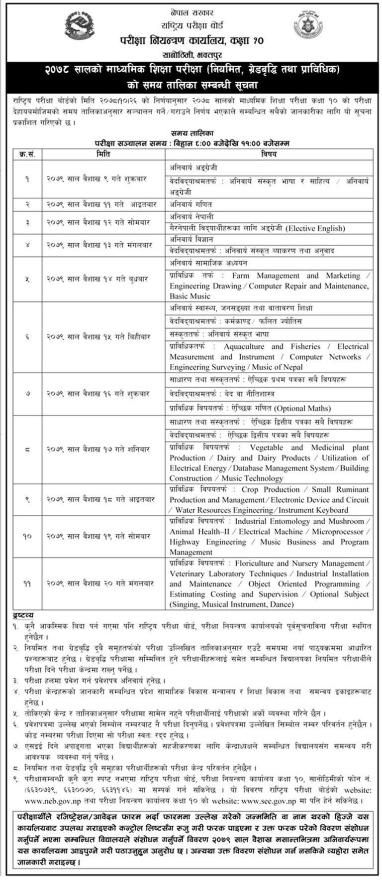 तालिका अनुसार आगामी ९ वैशाखमा अनिवार्य अंग्रेजी विषयको परीक्षा हुनेछ । सोही दिन वेदविद्याश्रम तर्फ अनिवार्य संस्कृत भाषा र साहित्यको पनि परीक्षा हुने तालिकामा उल्लेख छ । ११ वैशाखमा अनिवार्य गणित र १२ मा अनिवार्य नेपालीको परीक्षा हुनेछ ।