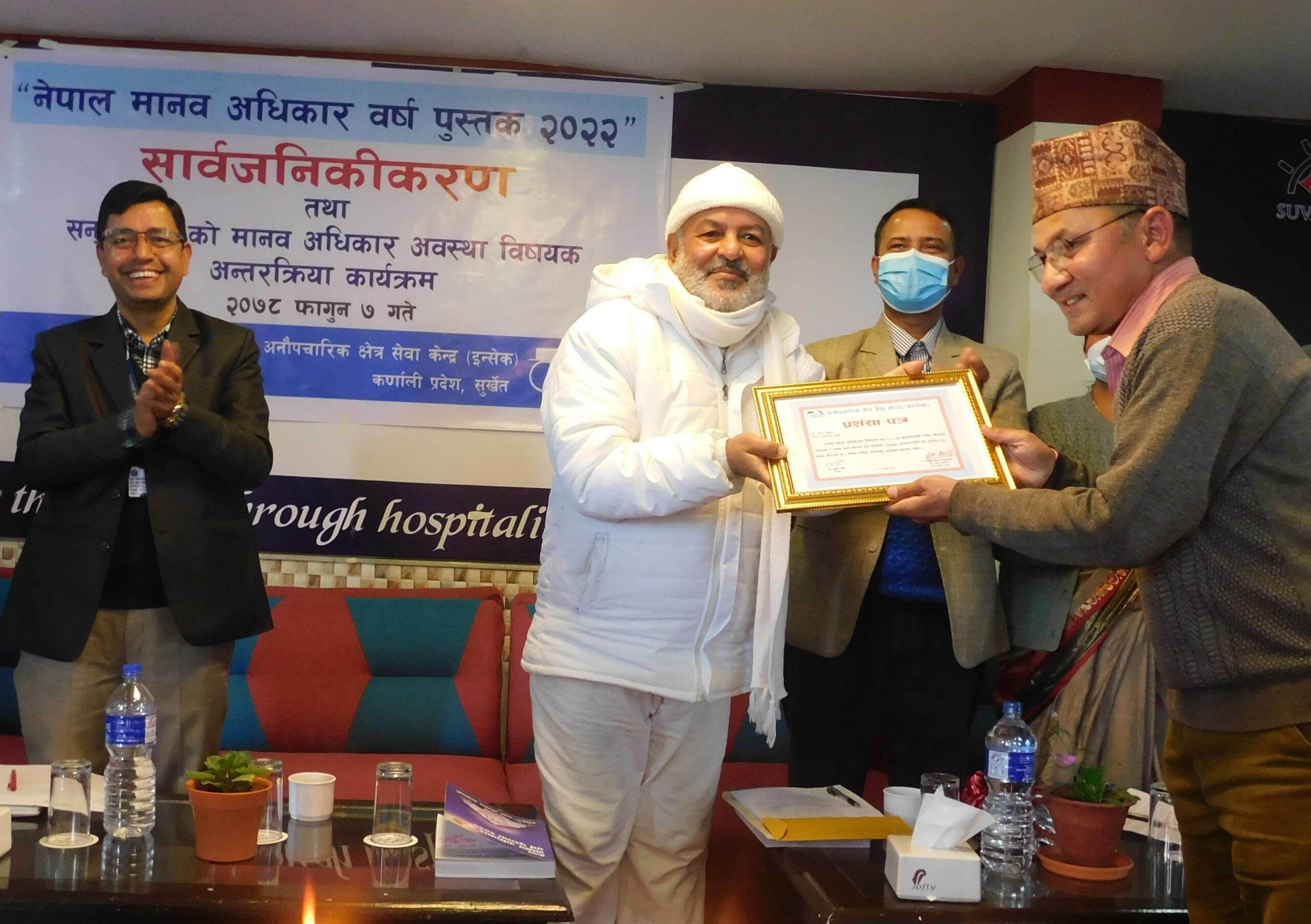 त्यसबखत इन्सेकको मानव अधिकार वर्ष पुस्तकका लागि कर्णाली प्रदेश स्तरमा मानव अधिकार उलंघन र ज्यादतीका घटनाको अनुगमन तथा अभिलेखीकरणमा उल्लेख्य काम गरेको भन्दै दैलेखका इन्सेक जिल्ला प्रतिनिधि अमर सुनारलाई ७ हजार नगद, दोसल्ला र प्रमाणपत्रसहित पुरस्कृत गरिएको थियो ।