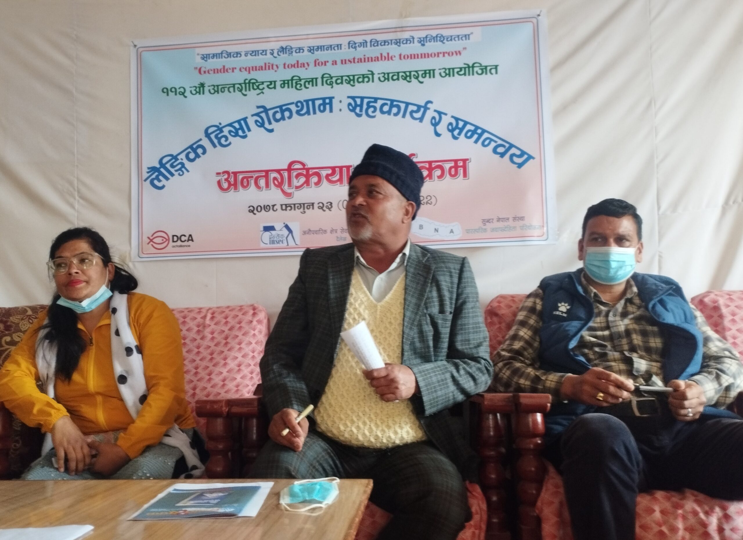 ११२ औँ अन्तर्राष्ट्रिय महिला दिवसको अवसरमा अनौपचारिक क्षेत्र सेवा केन्द्र (इन्सेक) र सुन्दर नेपाल संस्थाले आयोजना गरेको लैङ्गिक हिंसा रोकथामका लागि सरोकारवालाहरूबिच सहकार्य र समन्वय विषयक अन्तरक्रिया कार्यक्रममा उनले आफ्नो बिचार राखेका हुन् ।