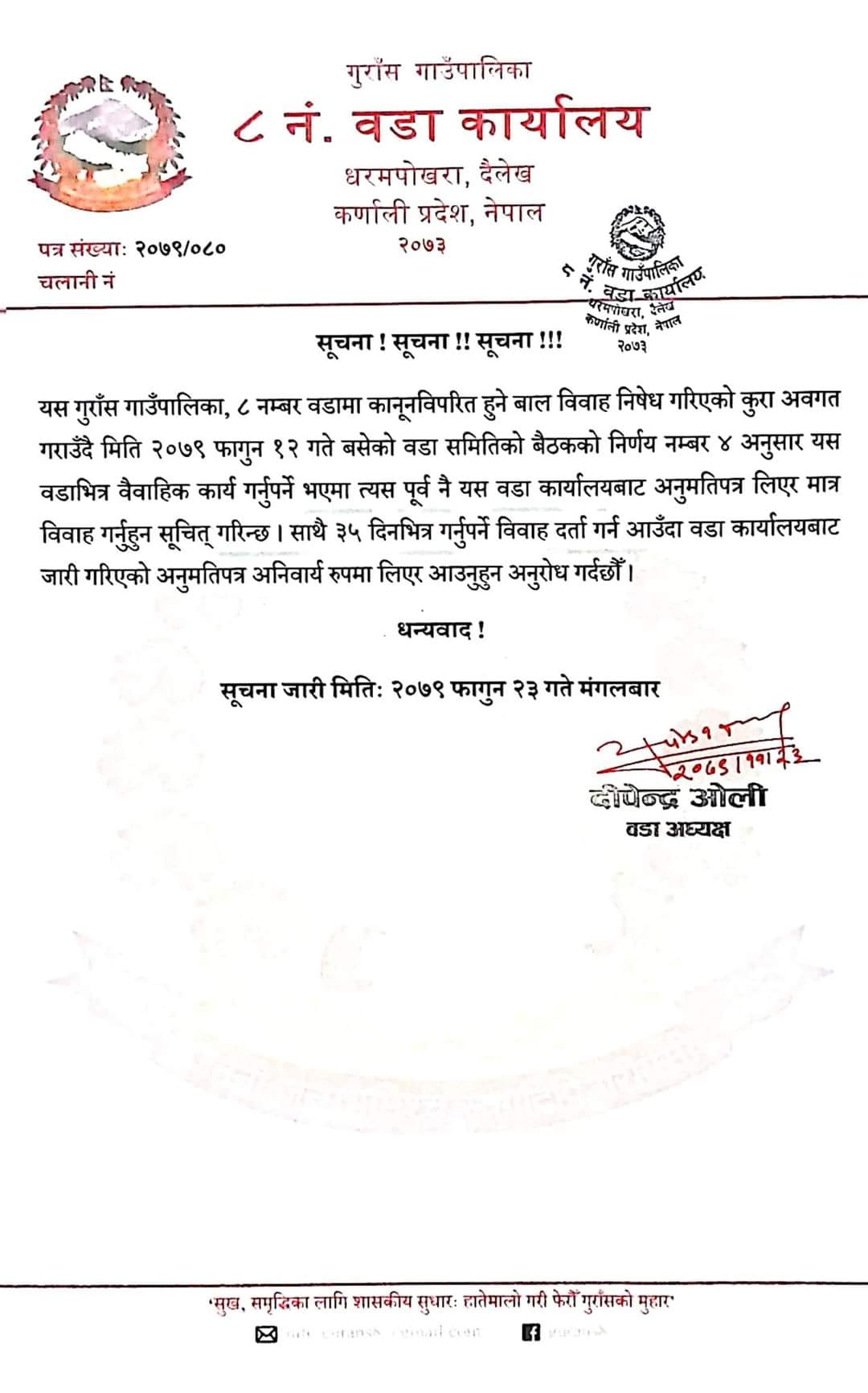 दैलेख : अब विवाहपूर्व अनिवार्य अनुमति लिनुपर्ने भएकाे छ । दैलेखको गुराँस गाउँपालिका–८ ले वडाभित्र विवाहसम्बन्धी नयाँ नियम लागु गरेको हाे। अबदेखि विवाह गर्नुभन्दा पहिला नै वडाको सिफारिस लिनुपर्ने नियम लागु गरिएको वडाध्यक्ष दीपेन्द्र ओलीले जानकारी दिए ।