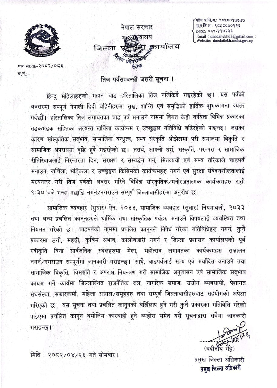 दैलेख: जिल्ला प्रशासन कार्यालयले हिन्दु महिलाहरूको महान् चार्ड हरितालिका तिजको अवसरमा राति ९ बजेपछि कुनै पनि मनोरञ्जनात्मक कार्यक्रम नगर्न आग्रह गरेको छ।